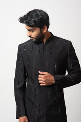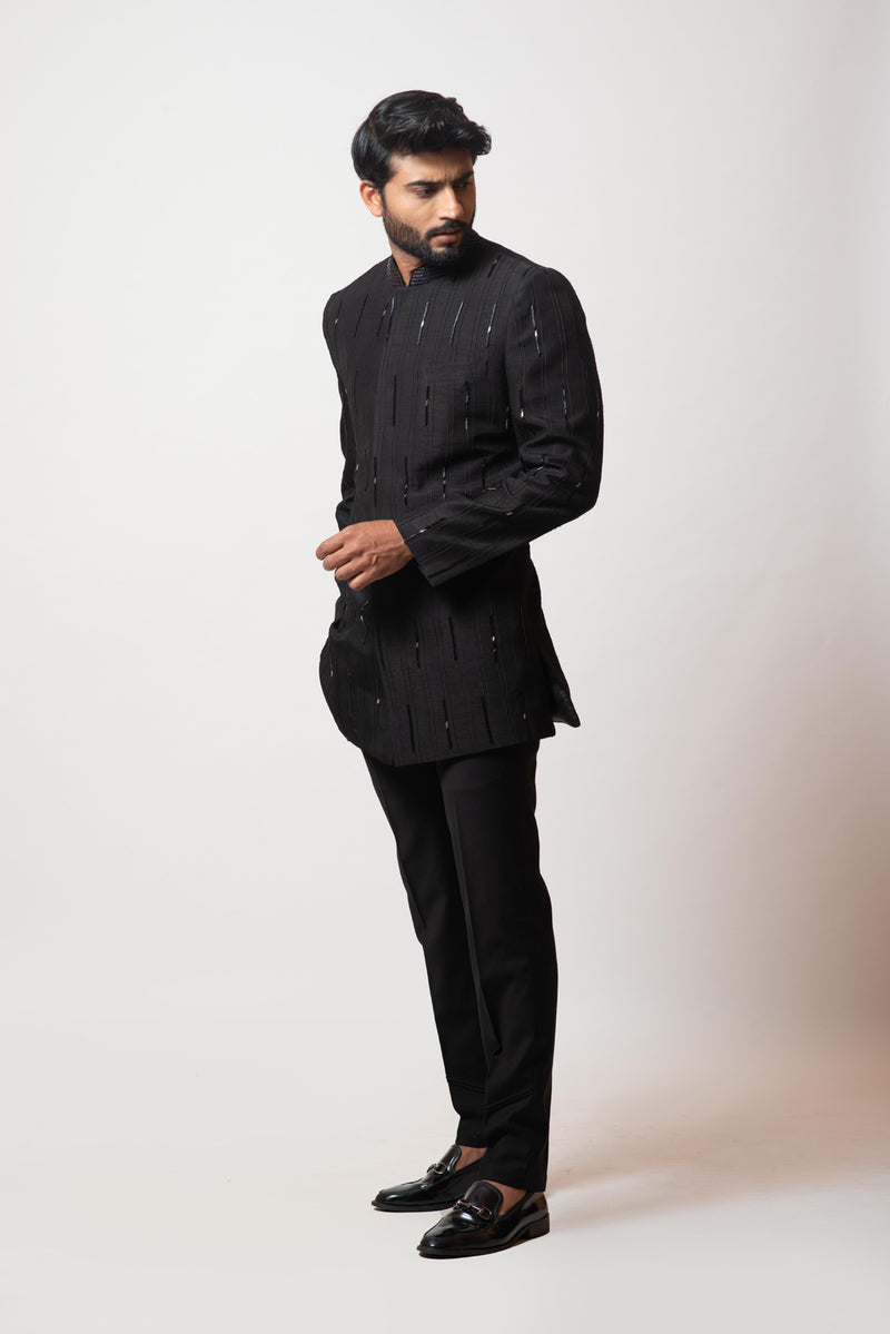 Black bandhgala with pintucks, embellished with tonal and silver cutdana, paired with trousers.Bandhgala length is 29".**The color may slightly vary due to screen lighting.
