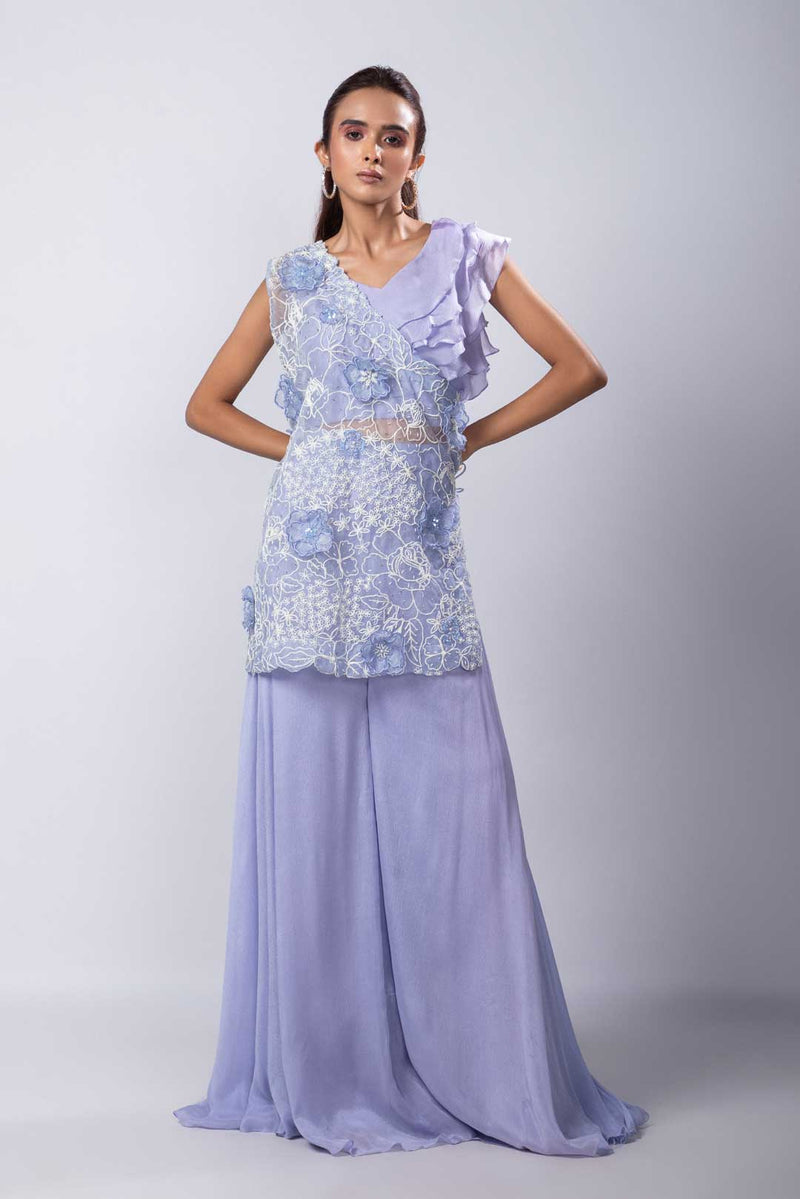 one shoulder cape that features layers of embroidery to achieve that couture look. This lavender set features a blouse, flared pants and a one shoulder cape that ties up the look together.