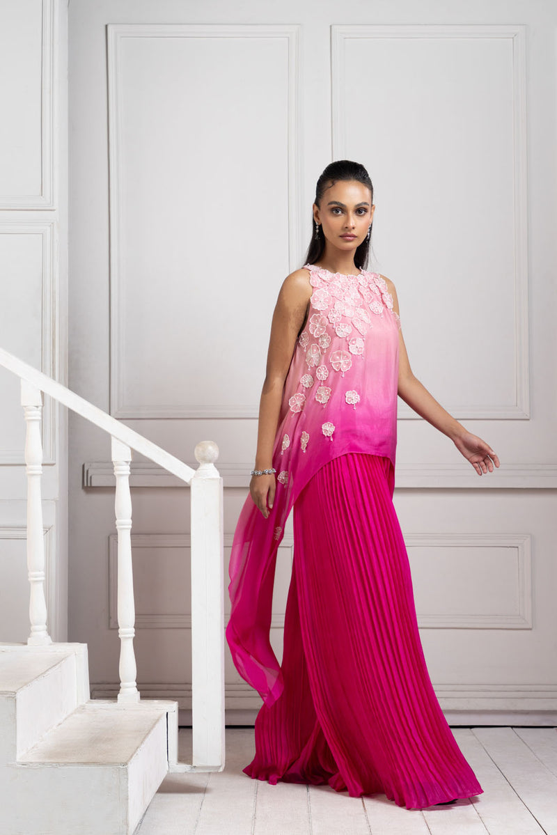Brighten up your wardrobe with this Rani pink asymmetric set. Featuring intricate floral appliqués on the bodice and a high-low design, it flows effortlessly into a pleated cascade pant that adds a dramatic flair. The lightweight fabric and elegant detailing make this ensemble perfect for daytime festivities, haldi ceremonies, or summer soirées. Radiate charm and confidence in this eye-catching piece.