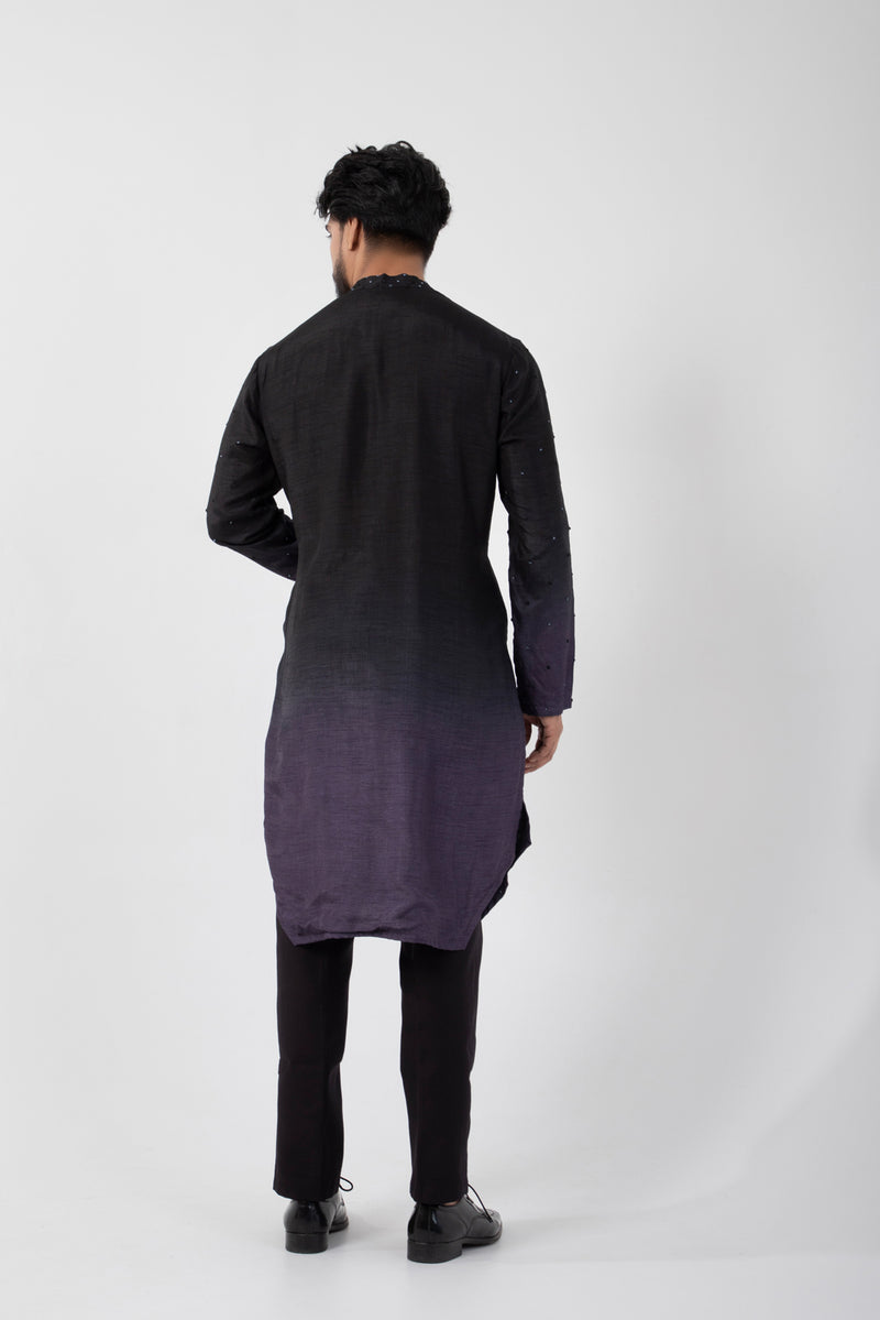 The black and grey ombre kurta is adorned with small beads, adding a touch of elegance and sparkle to its modern gradient design. Comes with black pant pajama.