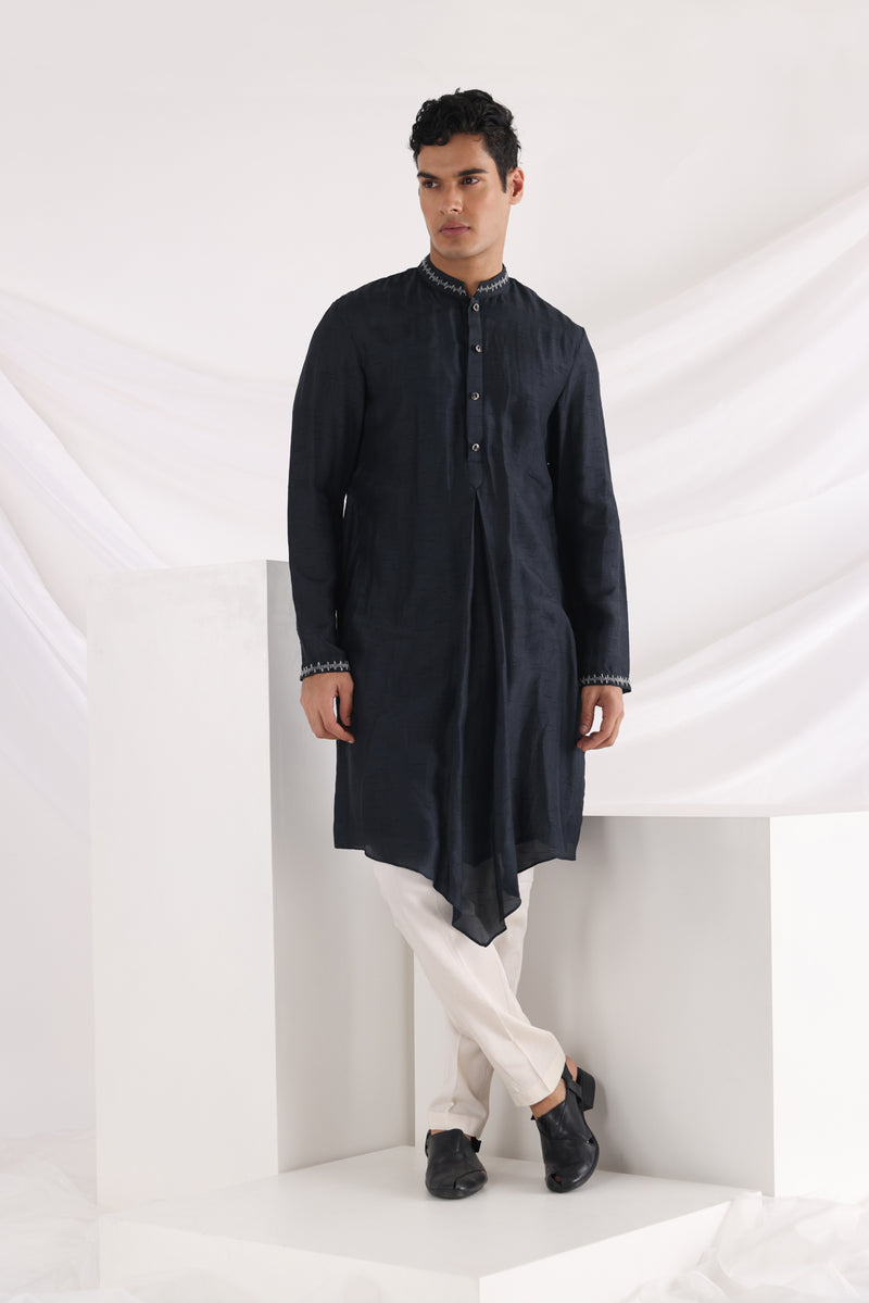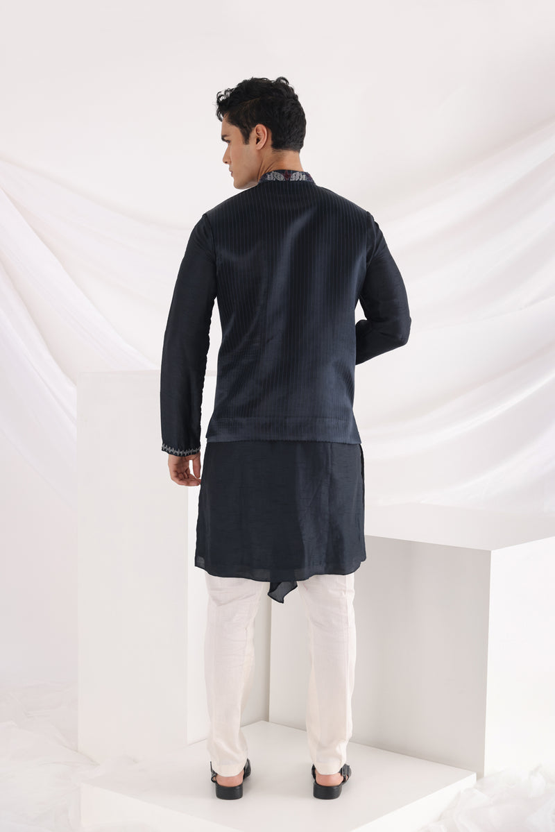 Display a clean look with this patchwork nehru, prepared with the finest of embellishments that enhance its appeal. A touch of sequins bring a whimsical twist to this kurta. the zigzag emboidery on the collar and cuffs in charcoal blue is the balance it needed for that effortless look.
