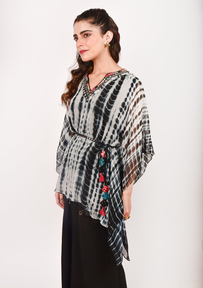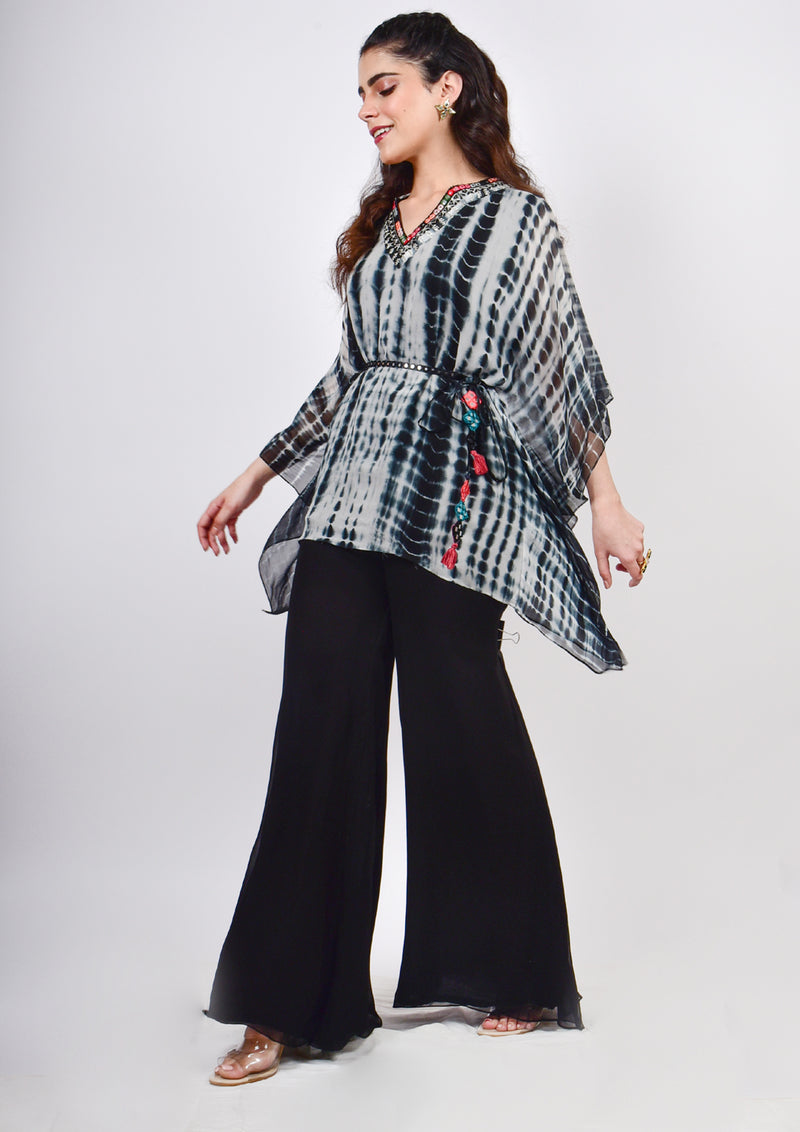Featuring a Tie Dye Kaftan top with black pants that fit at the thighs. A narrow string belt with colorful tassels shapes the waistline and increases the fashion quotient of the ensembe. This piece consists of a kaftan , palazzo and a belt . Length : Kaftan 28" , Pants 42''.