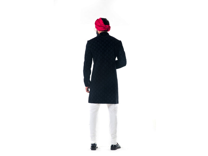 Featuring a Black Velvet Self Embroidered Sherwani Set. The piece has a thread work self embroidery all over the sherwani with a side pocket. FABRIC SPECIFICATION: The sherwani is made up of velvet fabric and the churidar is made up of cotton silk fabric. WASH CARE INSTRUCTIONS: Dry clean only.Steam iron only.Do not wash(Possibility of slight colour variation). This piece consists of a sherwani and a churidar.PRODUCT CODE: GKA2476