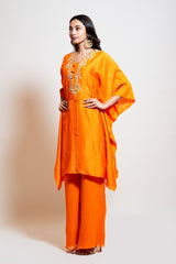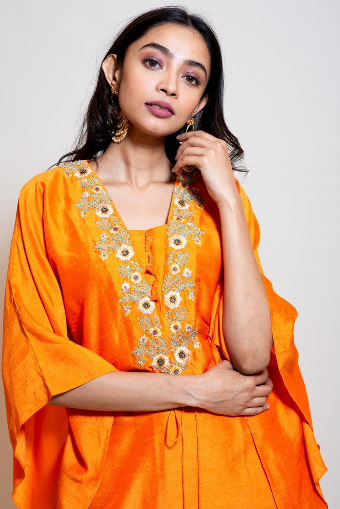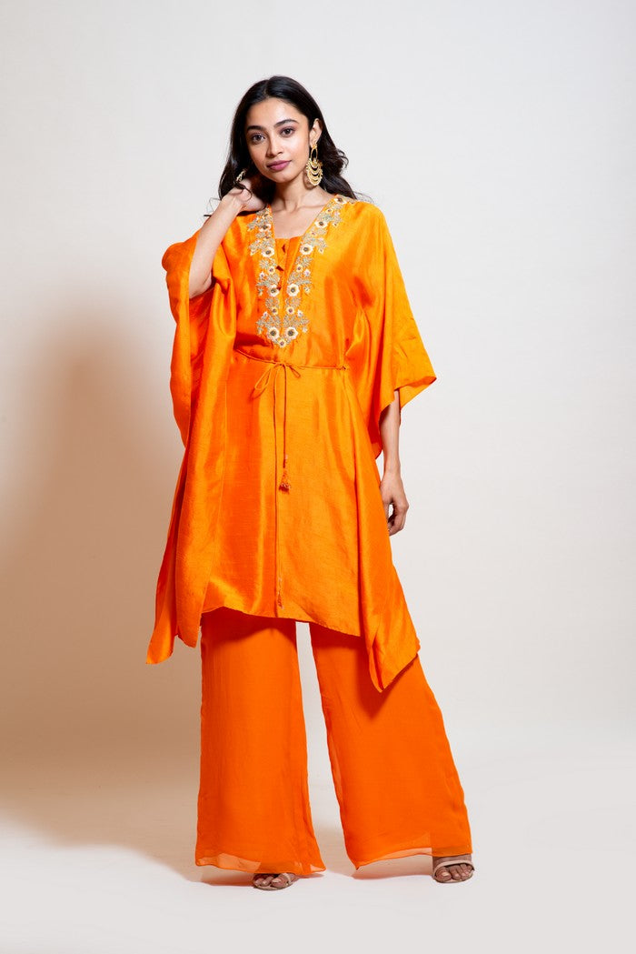 Featuring a bright orange embroidered neckline short kaftan with tie up detailing at the waist. The kaftan is paired with flared pallazo pants.