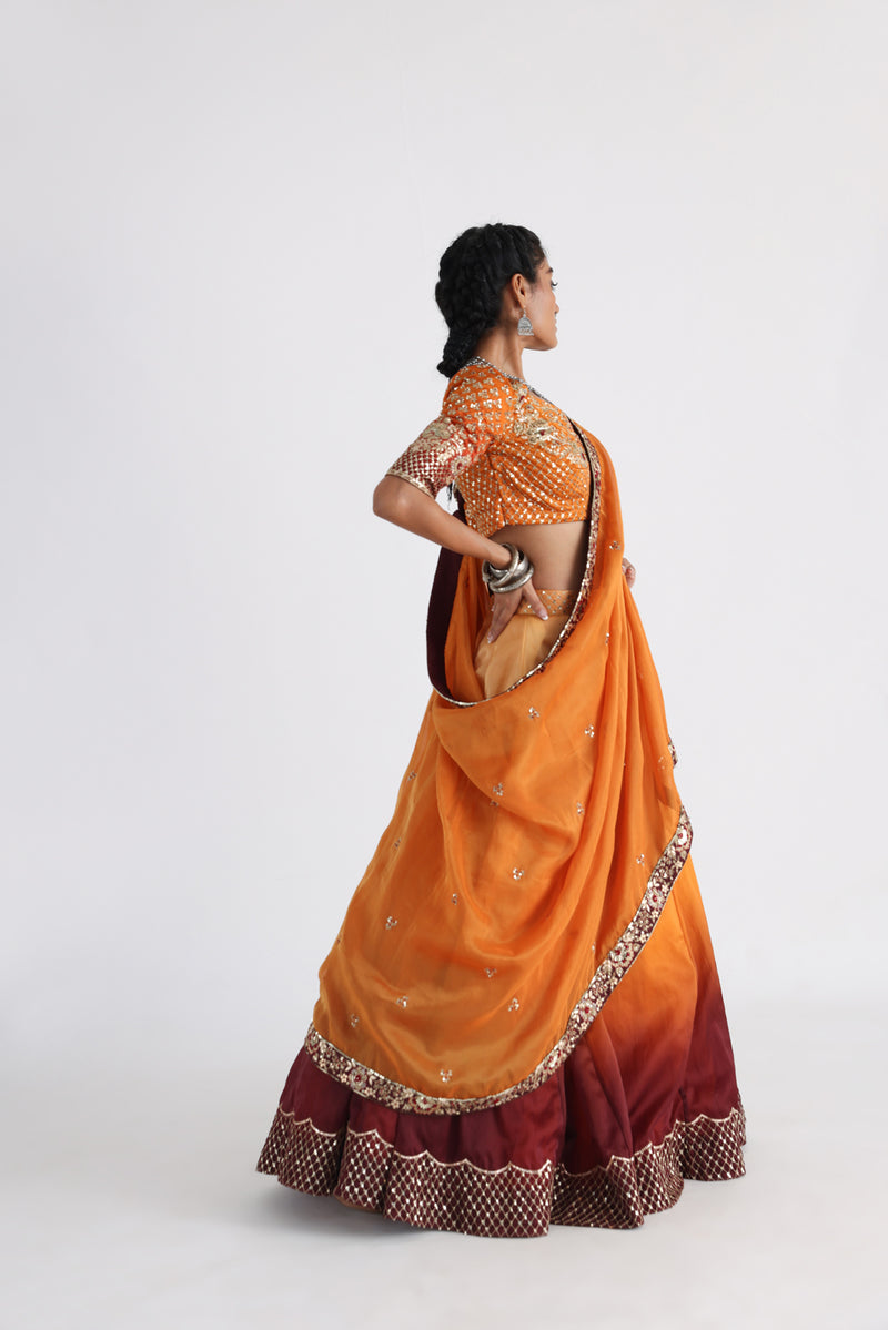 Blouse- satin organza tafetta, lehenga- satin organza tafetta, dupatta- tissue bam silk |
