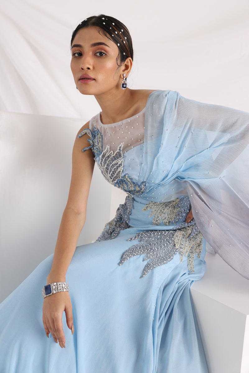 a beautiful light blue lehenga highlights elegant handwork in white.