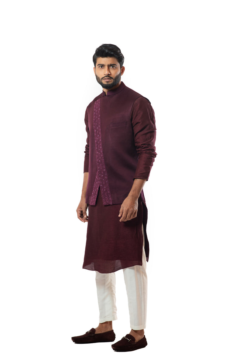 Wine straight hand embroidered kurta paired with highlighted embroidered nehru jacket which comes along pant pajama. Kurta length is 43", nehru length is 29".**The color may slightly vary due to screen lighting.