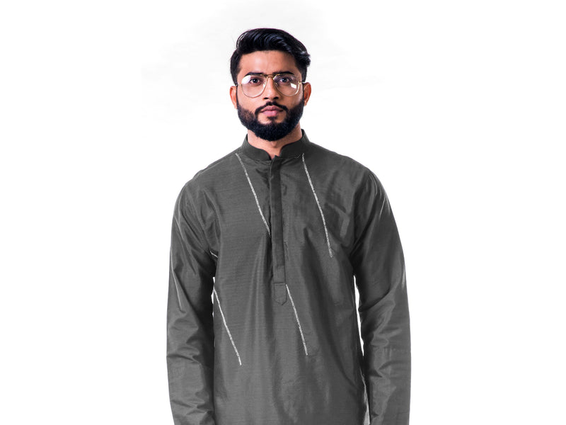 Featuring a Grey Asymmetrical Hemline Embroidered kurta Set.The kurta has a asymmetrical hemline along with abstract kasab embroidery work. FABRIC SPECIFICATION: The kurta and the churidar are made up of cotton silk fabric. WASH CARE INSTRUCTIONS: Dry clean only.Steam iron only.Do not wash(Possibility of slight colour variation). This piece consists of a kurta and churidar pants.Length : 47 PRODUCT CODE: GKA2531