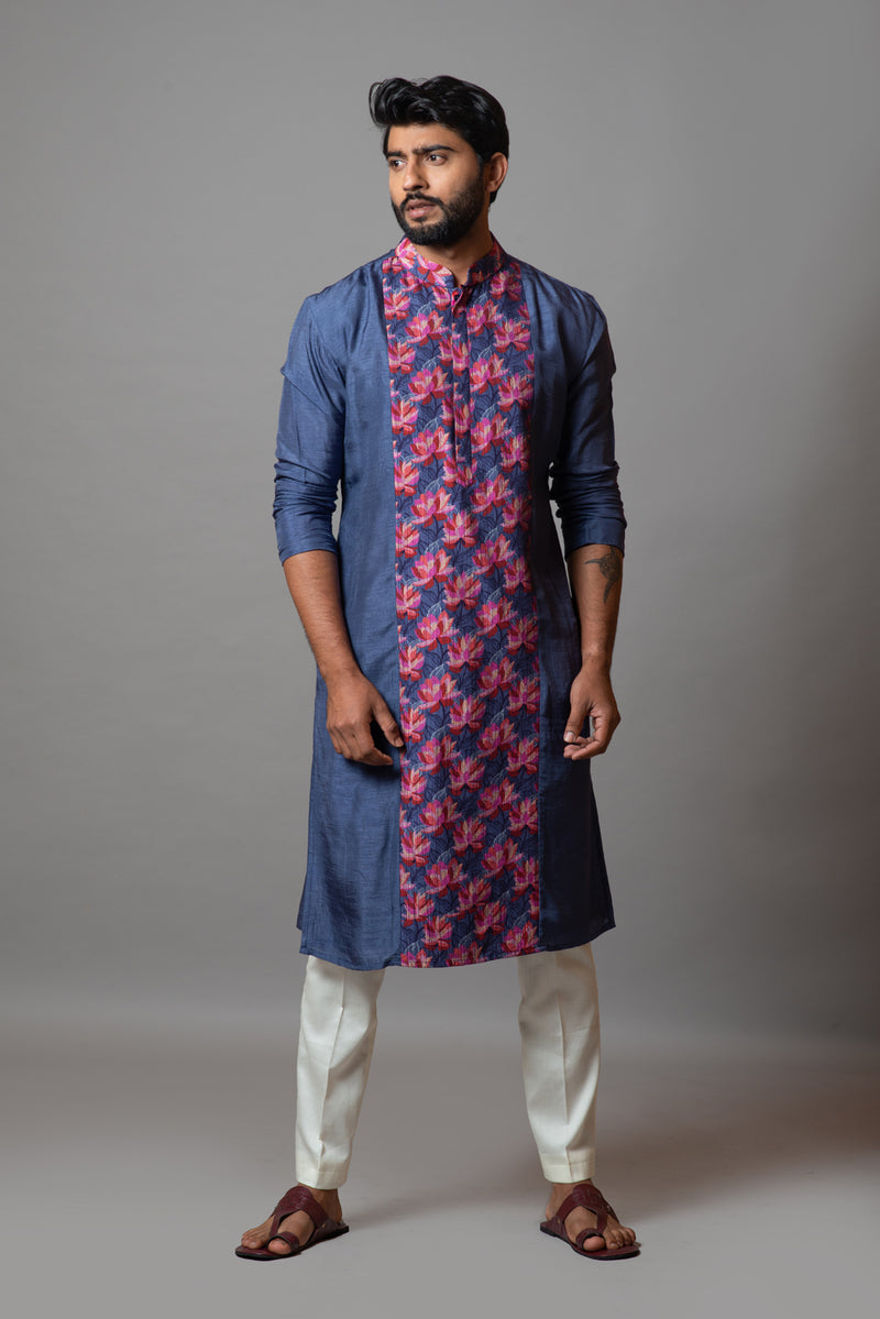 Grey kurta with leaf print center panel with stitch lines, paired with pant pajama. Kurta Length is 42".**The color may slightly vary due to screen lighting.