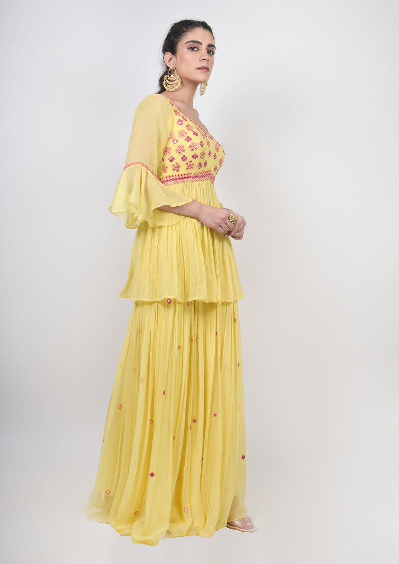 Lemon yellow gathered sharara with peplum set , embellished with mirrorwork. This piece consists of a top and a pant. Length : Peplum top 30" Pant : 42".