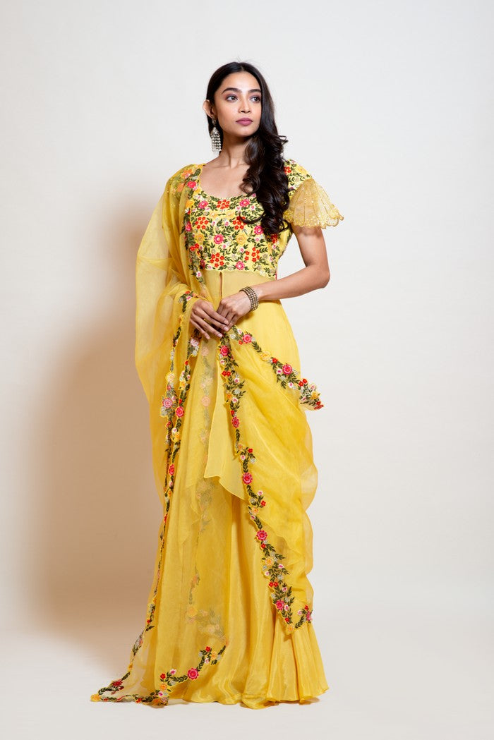 Featuring a Light yellow orave cut kurta embellished with multicolor embroidery having front slit paired with bell bottom flared pants. The butterfly sleeve with cutdana work adds a bit glamour to the piece. The dupatta is also embellished with multicolor floral embroidery on the edges.