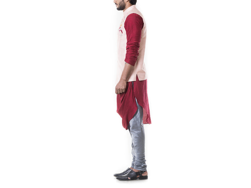 Maroon Cowl Kurta and Grey Churidar with Pink Waist Coat Set.