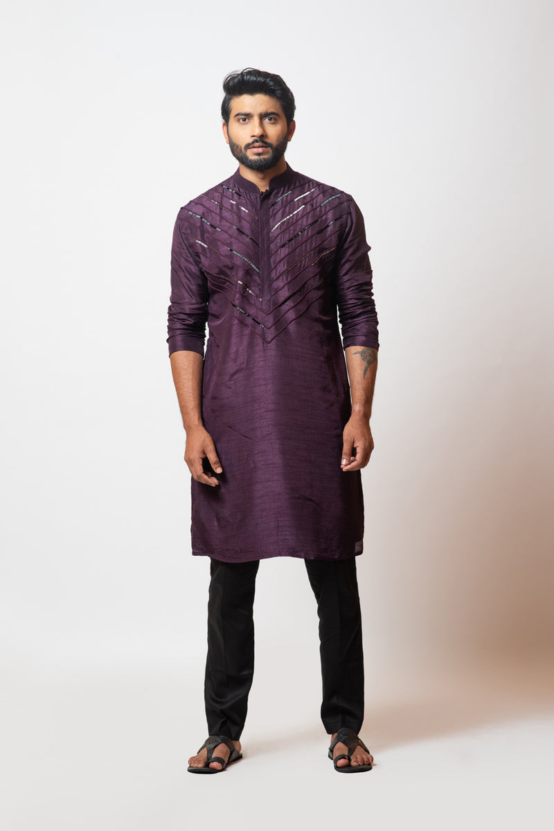 Plum kurta with codding done around the neckline, embellished with tonal and black pipe, paired with pant pyjama.Kurta length- 41. **The color may slightly vary due to screen lighting.