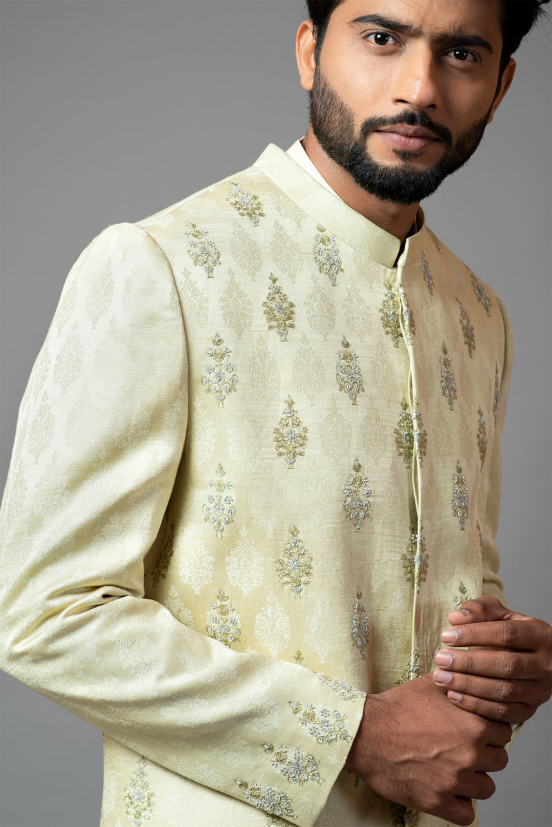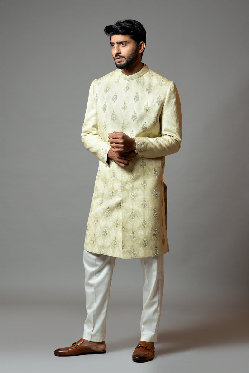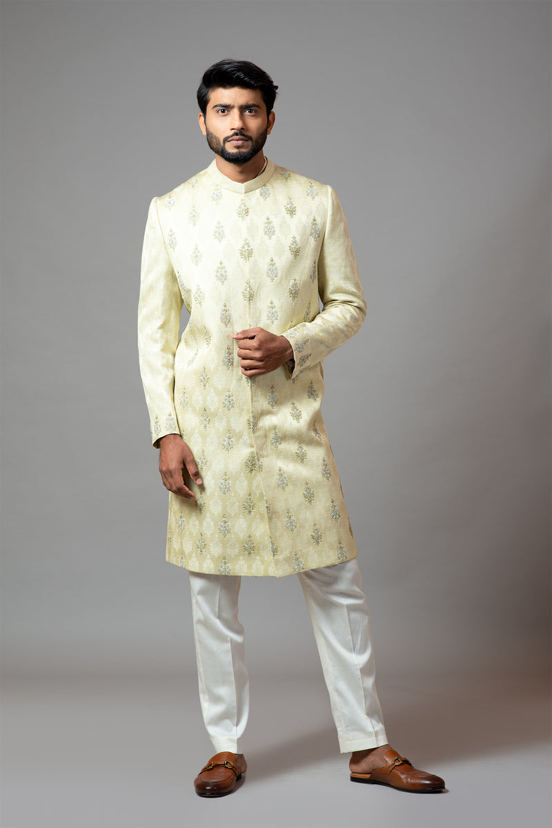 Self textured buti embroidery with threads and sequins sherwani comes with pant pajama/churidar